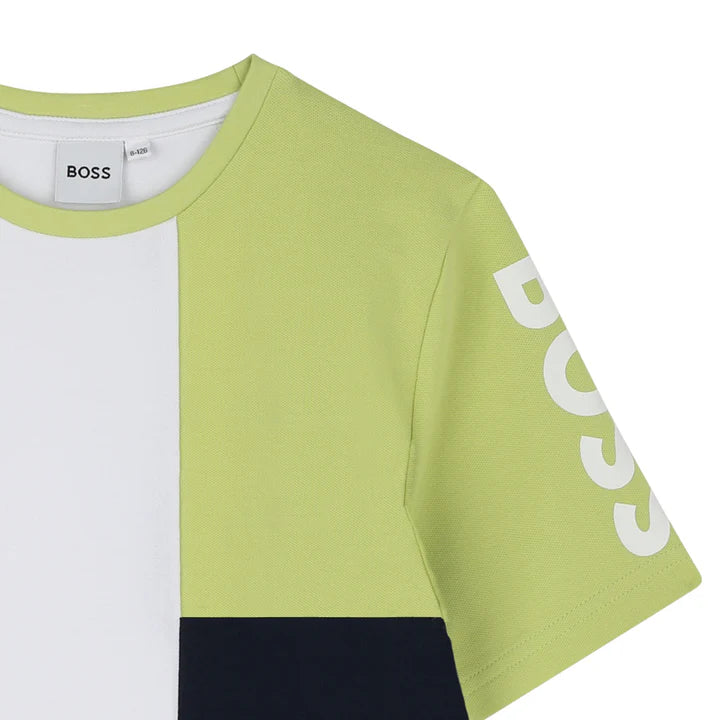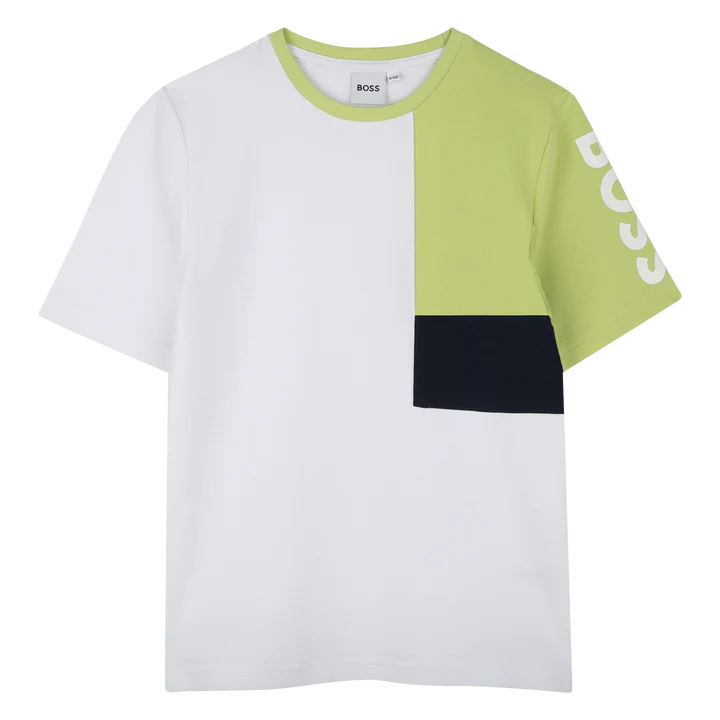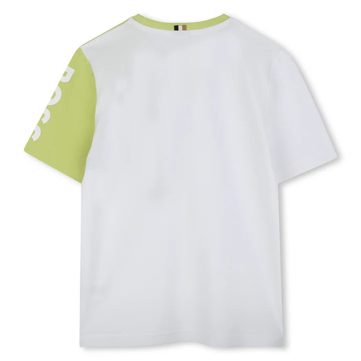 BOSS Boys White Shirt Lime Sleeve Asymmetric T-Shirt
